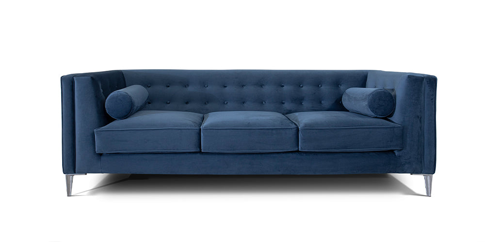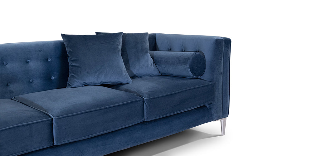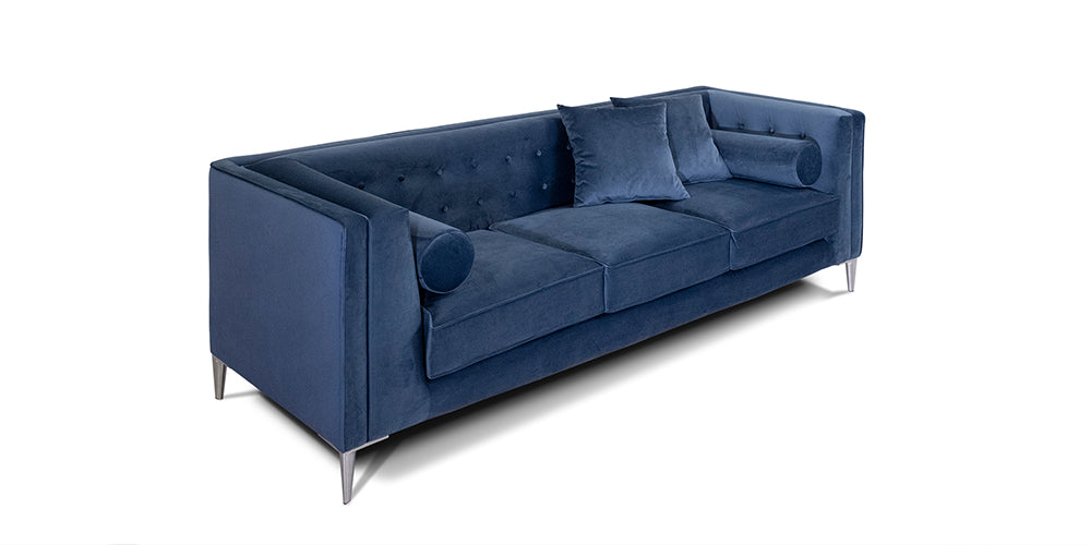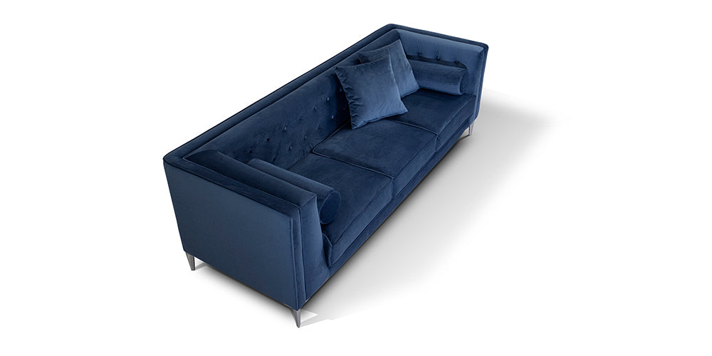 Glamour moderne au charme anglo-américain. Embelli par des coussins tubulaires et des boutons. Finitions couture avec passepoil en tissu.