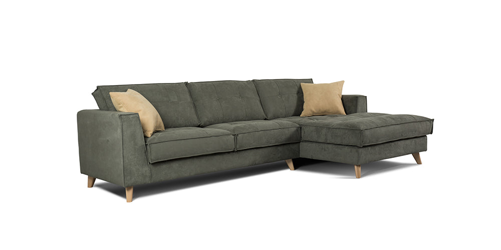 Projet au design unique, lignes modernes et séduisantes, avec des détails de matelassage sur les coussins et un pied en bois. Des finitions artisanales rétro comme les surpiqûres à boutons sur les assises et les dossiers, finies par des coutures nervurées, associées à un pied vintage en bois.